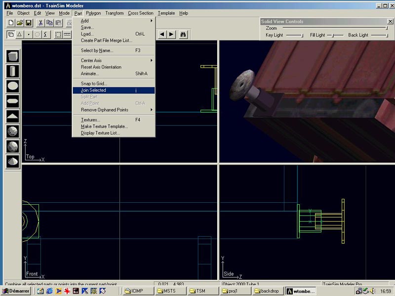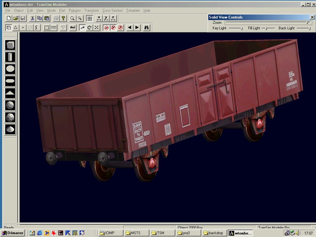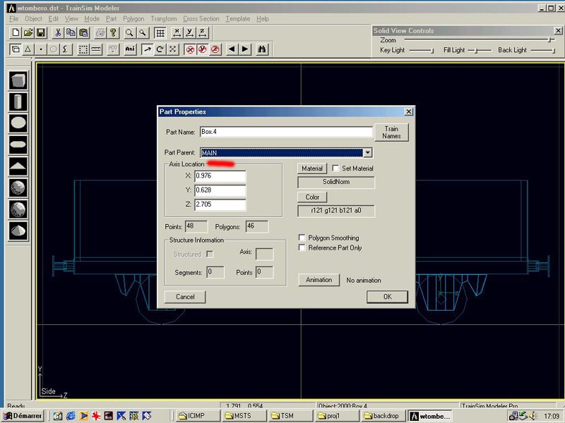 Voilà le travail ! C'est acceptable pour un début, donc Sauvegardons! Le modèle n'est pas encore correct : Il faut vérifier la hiérarchie des éléments et les axes de référence pour qu'il soit correct sous MSTS. Pour cela on va par exemple choisir la vue de côté et passer en plein écran (Touche droite et "Extended view") puis "Zoom In" suffisant. Il va falloir passer en revue tous les éléments (Parts) un par un (touche N) et pour chacun lui donner obligatoirement un Parent. (touche F2) Dans ce wagon, il y a 3 éléments importants : le chassis dont le repère doit être à l'origine des axes et les deux essieux dont le père doit être le chassis. |