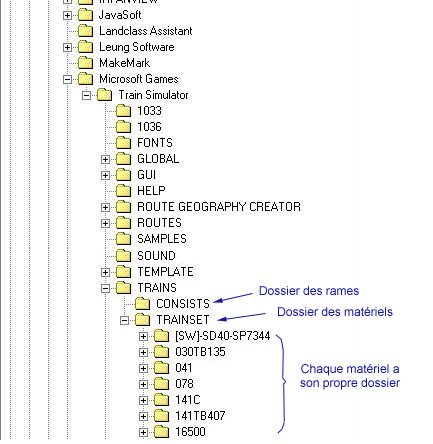 Tout le matériel utilisé dans Train Simulator doit être installé dans le dossier TRAINSET comme présenté dans la vue de l'explorateur ci-dessous :Le contenu d'un dossier de locomotive se présente en général sous la forme ci-dessous.