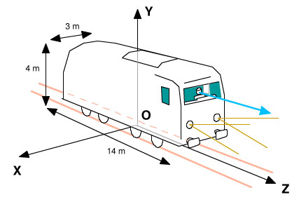 Chaque fois que des coordonnées sont spécifiées sur un matériel (position des feux, point de vue du conducteur dans la cabine), elles le sont dans le repère de base décrit ci-dessous. L'origine est située à l'aplomb du centre du matériel et au niveau de la surface des rails au milieu de la voie. La marche avant est dans le sens des Z positifs.
