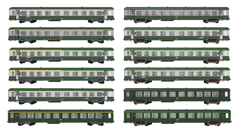 Voitures dites de "service intérieur" à couloir central. Construites de 1962 à 1974 par ANF et désignées USI ou DEV SI, elles sont toujours largement en service. Les modèles disponibles sont d'abord les B10t (1 salle) du programme 60-61 à bogies Y16 et les B4t4, A4t4 (salles et compartiments) à bogies Y28 aptes à 160 km/h.