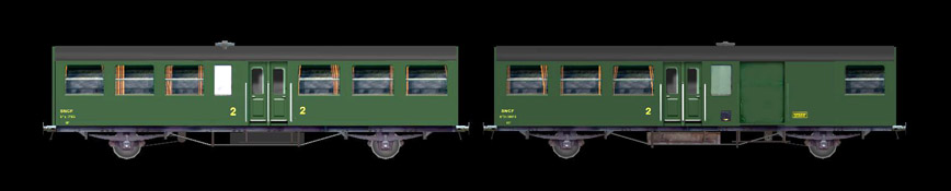 Après la seconde guerre mondiale, le parc SNCF en sous effectifs fut complété par la reconstruction de voitures à ossature bois à deux essieux des anciens réseaux. Ce sont surtout les voitures issues des anciens réseaux de l'Etat et du PO-Midi qui subirent ces modifications dès 1949. Elles ont été très utilisées dans les années 1950 à 1968 dans des rames de banlieue ou même de petits express. On les voyait très souvent dans des rames avec traction vapeur ou avec les premières diesels de ligne comme celle qui deviendra la future BB66000.After the Second World War during the 1949-1955 period, SNCF rolling stock was completed by reconstruction of old two-axles wooden body carriages (build before 1921) from ETAT and PO-MIDI railway networks. They have been widely used in the years 1950 to 1968 in suburban trains or even small express. Many metallized from PO-MIDI were used as railcars carriages (XR).